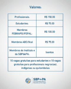 O evento é destinado ao público externo da área psi e reafirma o compromisso da SBPdePA com o debate ético, a qualificação da formação psicanalítica e a sustentação do pensamento crítico na contemporaneidade. Trata-se de uma atividade paga, com vagas gratuitas destinadas a profissionais e estudantes negros(as), indígenas ou quilombolas, ampliando o acesso e promovendo a diversidade no campo psicanalítico.
