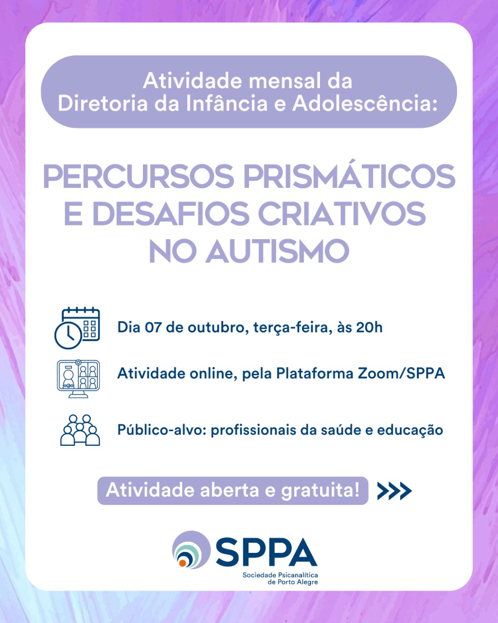 Convidamos para a Atividade Mensal da Diretoria da Infância e Adolescência: “Percursos prismáticos e desafios criativos no autismo”, dia 07 de outubro, às 20h, pela Plataforma Zoom/SPPA.