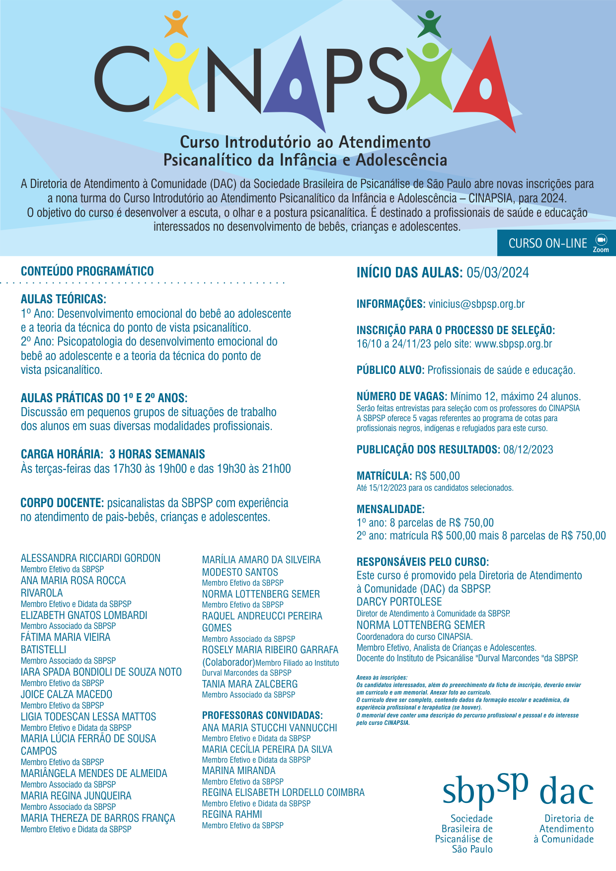 A Diretoria de Atendimento à Comunidade (DAC) da Sociedade Brasileira de Psicanálise de São Paulo abre novas inscrições para a nona turma do Curso Introdutório ao Atendimento Psicanalítico da Infância e Adolescência – CINAPSIA, para 2024.