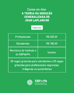 A atividade é destinada ao público interno e externo, incluindo profissionais de outras áreas, reafirmando o compromisso da SBPdePA com a formação contínua, a troca de saberes, o diálogo interdisciplinar e o fortalecimento do pensamento psicanalítico.