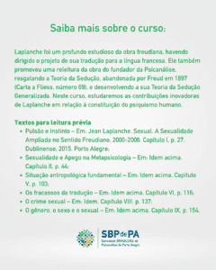 O curso tem coordenação de Susana Salete R. Chinazzo e conta com a participação de Patricia Rivoire Menelli Goldfeld, professora doutora, psicanalista titular com função didática da SBPdePA, como convidada. A proposta oferece um estudo aprofundado das contribuições de Jean Laplanche, um dos mais rigorosos estudiosos da obra freudiana, responsável pela direção do projeto de tradução de Freud para a língua francesa e por uma releitura consistente do pensamento do fundador da psicanálise.