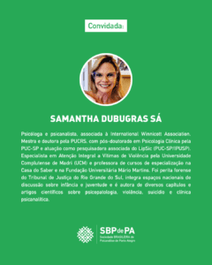 Participam da programação Samantha Dubugras Sá e Gley Silva de Pacheco Costa, cujas contribuições ampliam o debate teórico-clínico a partir de suas experiências na psicanálise.