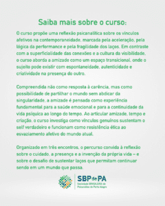 O curso propõe uma reflexão psicanalítica sobre os vínculos afetivos na contemporaneidade, marcada pela aceleração do tempo, pela lógica da performance e pela fragilidade dos laços. Em contraste com a superficialidade das conexões e a cultura da visibilidade, a proposta aborda a amizade como espaço transicional, no qual o sujeito pode existir com espontaneidade, autenticidade e criatividade na presença do outro.