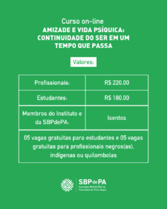 A atividade é destinada ao público interno e externo da área psi, reafirmando o compromisso da SBPdePA com a formação contínua, a troca de saberes e o fortalecimento do pensamento psicanalítico.