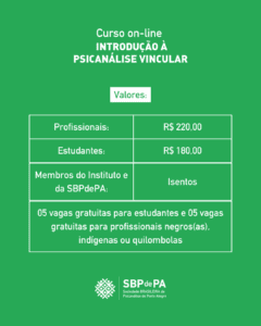 A atividade é destinada ao público interno e externo, incluindo profissionais de outras áreas, reafirmando o compromisso da SBPdePA com a formação contínua, a troca de saberes, o diálogo interdisciplinar e o fortalecimento do pensamento psicanalítico.