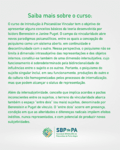 O curso tem como objetivo apresentar conceitos fundamentais da teoria da Psicanálise Vincular, desenvolvida por Isidoro Berenstein e Janine Puget, propondo uma ampliação dos referenciais clássicos da psicanálise. O campo da vincularidade introduz novos paradigmas ao conceber o psiquismo como um sistema aberto, em continuidade e descontinuidade com o outro, superando a centralidade exclusiva da dimensão intrassubjetiva.