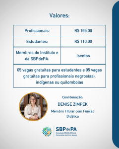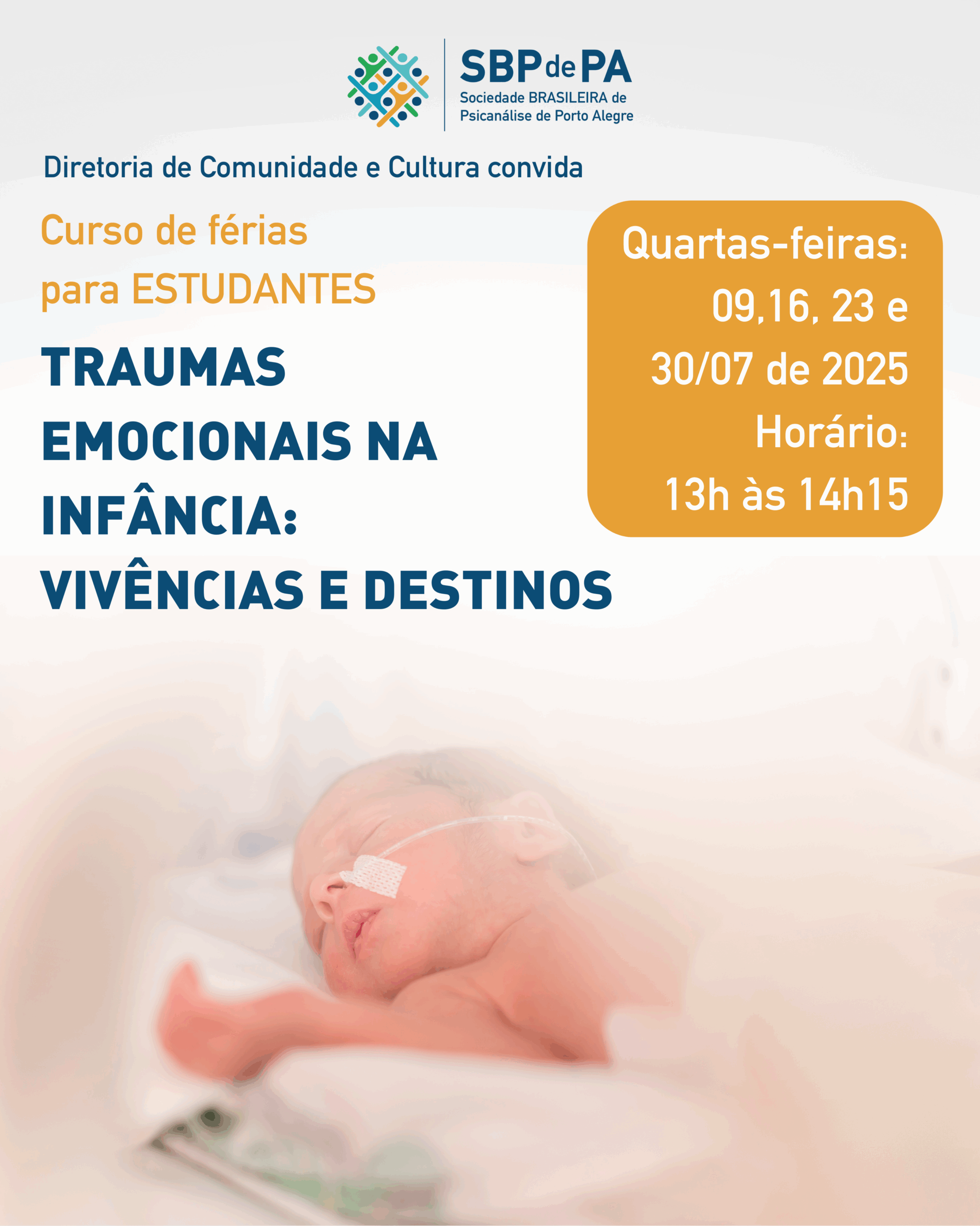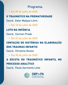 Este curso de férias foi pensado tendo em vista a Jornada Anual da Sociedade Brasileira de Psicanálise de Porto Alegre (SBPdePA), que acontecerá em agosto com o tema “Metapsicologia do Trauma”. A partir dessa temática central da Jornada, a Brasileira promove, no mês de julho, o curso “Traumas Emocionais na Infância: Vivências e Destinos”, voltado para estudantes de psicologia e medicina interessados na temática.