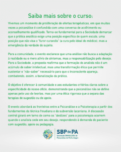 A atividade será ministrada por Júlio Sperb, psicanalista, Membro Associado da SBPdePA e da IPA, e é destinada ao público interno e externo, incluindo profissionais de outras áreas, reafirmando o compromisso da SBPdePA com a formação contínua, a troca de saberes, o diálogo interdisciplinar e o fortalecimento do pensamento psicanalítico.