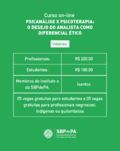 Nos dias 4 e 11 de fevereiro, das 10h15 às 11h45, a Sociedade Brasileira de Psicanálise de Porto Alegre realiza a atividade científica “Psicanálise x Psicoterapia: O Desejo do Analista como Diferencial Ético”, em formato on-line. A atividade integra a programação da instituição por meio da Diretoria de Comunidade e Cultura, sob coordenação de Susana Salete R. Chinazzo.