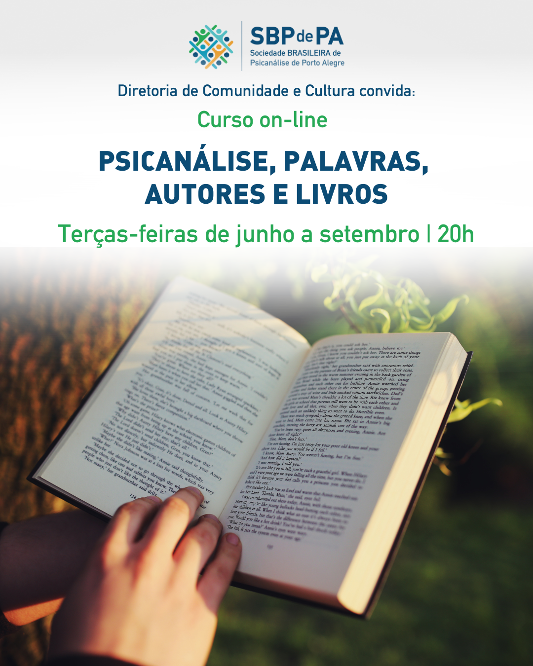 A Sociedade Brasileira de Psicanálise de Porto Alegre (SBPdePA), por meio da sua Diretoria de Comunidade e Cultura, convida para o curso “Psicanálise, palavras, autores e livros”, que acontecerá nas terças-feiras, às 20h, de junho a setembro de 2025, em formato on-line.