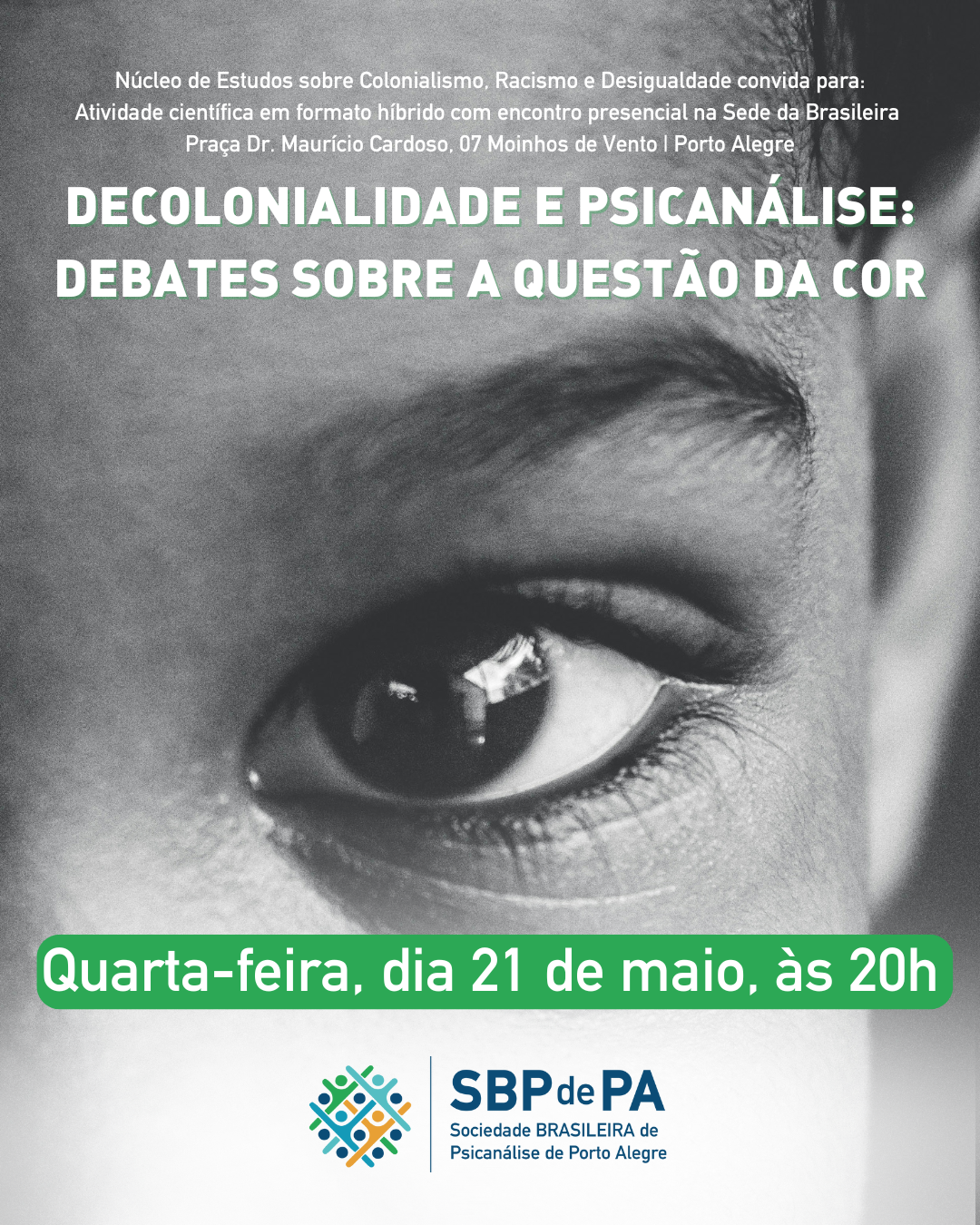 A Sociedade Brasileira de Psicanálise de Porto Alegre (SBPdePA), por meio do Núcleo de Estudos sobre Colonialismo, Racismo e Desigualdade, convida para a atividade científica “Decolonialidade e Psicanálise: debates sobre a questão da cor”, um encontro que propõe refletir sobre os atravessamentos raciais na constituição do sujeito, no campo transferencial e na própria construção do saber psicanalítico.