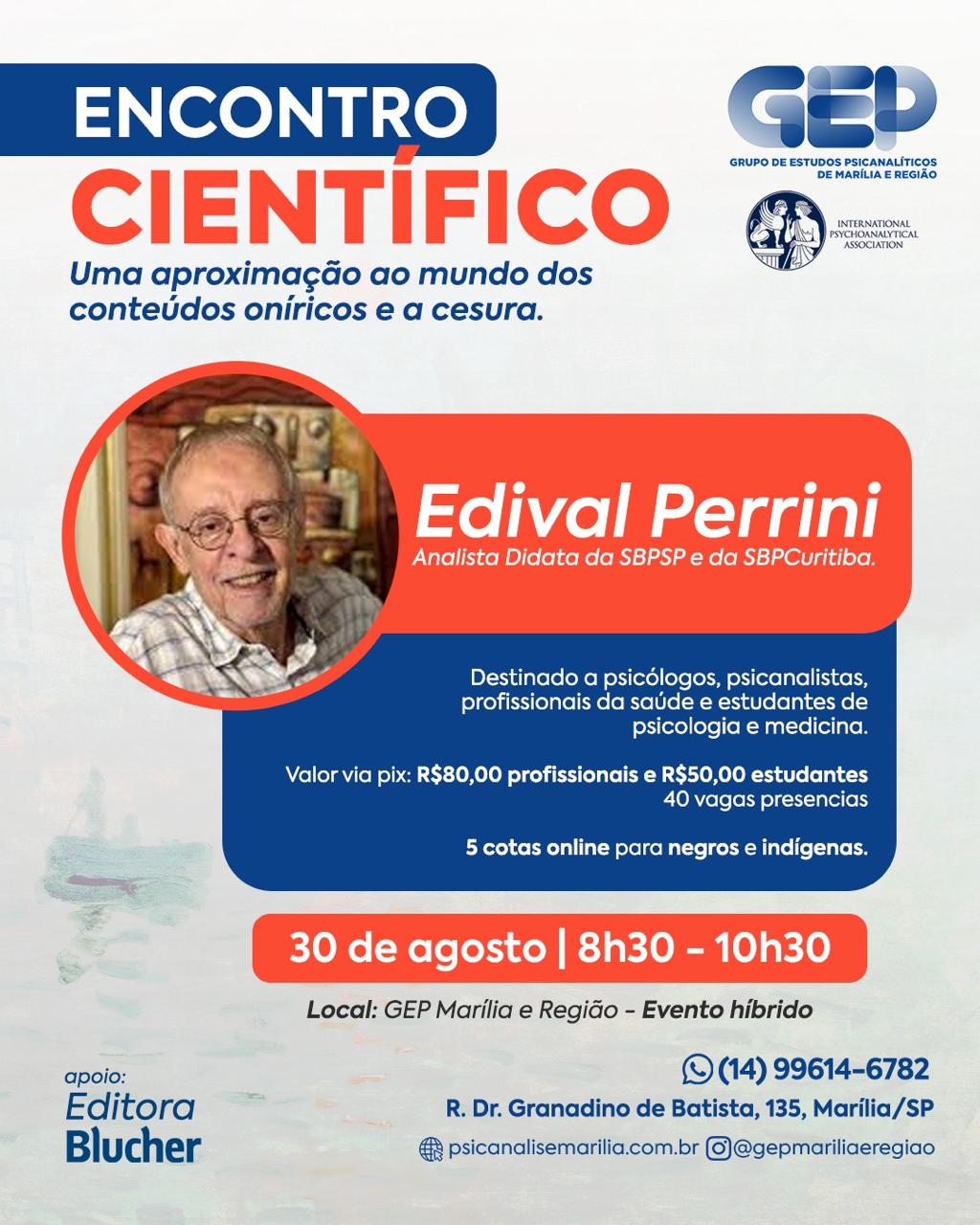 No dia 30 de agosto, sábado, o GEP Marília e região receberá em sua sede o escritor e psicanalista Edival Perrini que irá conduzir um Encontro Científico cuja abordagem será “Uma aproximação ao mundo dos conteúdos oníricos e a cesura”. Voltado aos profissionais da área de psicanálise, psicólogos, médicos, estudantes universitários das áreas de saúde mental. O evento será híbrido, das 8h30 às 10h30. São disponibilizadas vagas gratuitas online para indígenas e pessoas negras. O valor de investimento para este evento é de R$80 (profissionais) | R$50 (estudantes). Do verso à clínica, Perrini nos convida a atravessar as profundezas do sensível em uma manhã de estudo e troca.