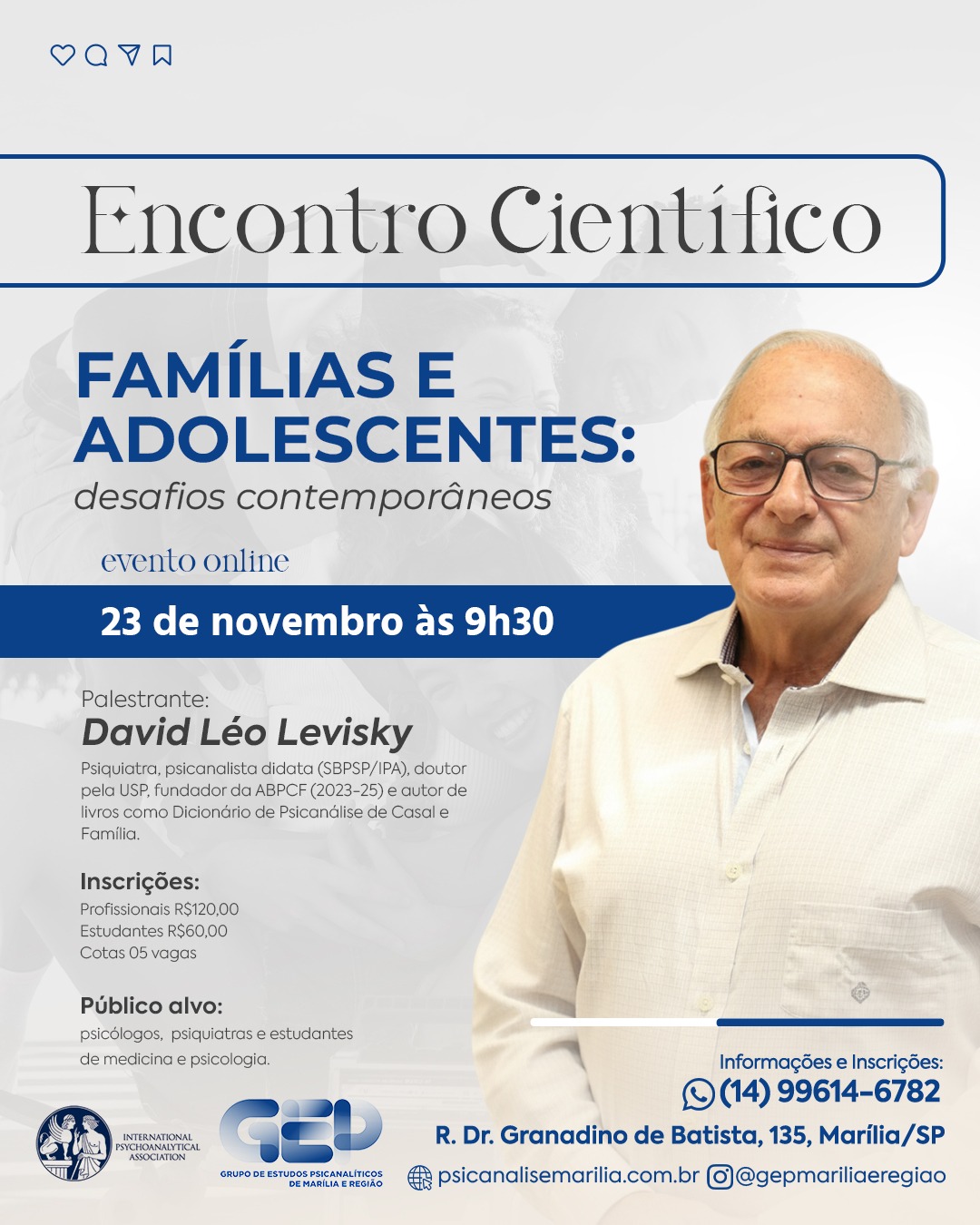 A atividade contará com a participação do psiquiatra e psicanalista didata David Léo Levisky (SBPSP/IPA), doutor pela USP e autor de obras como o Dicionário de Psicanálise de Casal e Família.