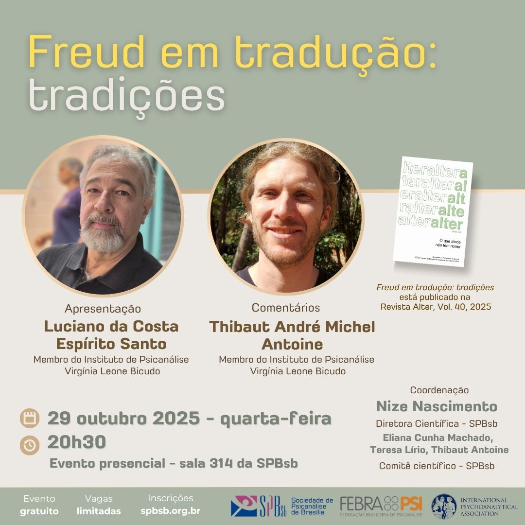 A Diretoria Científica da SPBsb convida para a reunião científica “Freud em tradição: traduções”, com apresentação de Luciano da Costa Espírito Santo, e comentários de Thibaut André Michel Antoine, ambos membros do Instituto de Psicanálise Virgínia Leone Bicudo.