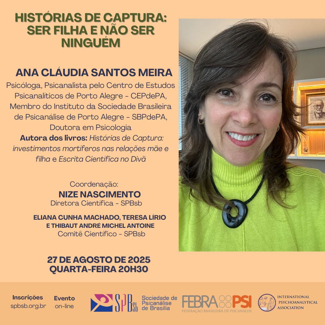 A Diretoria Científica da SPBsb promoverá a videoconferência “Histórias de Captura: Ser filha e não ser Ninguém” com apresentação de Ana Cláudia Santos Meira, Psicóloga, Psicanalista pelo Centro de Estudos Psicanalíticos de Porto Alegre – CEPdePA, Membro do Instituto da Sociedade Brasileira de Psicanálise de Porto Alegre – SBPdePA, Doutora em Psicologia. Autora dos livros: Histórias de Captura: investimentos mortíferos nas relações mãe e filha e Escrita Científica no Divã. A coordenação será de Nize Nascimento, diretora científica da SPBsb.