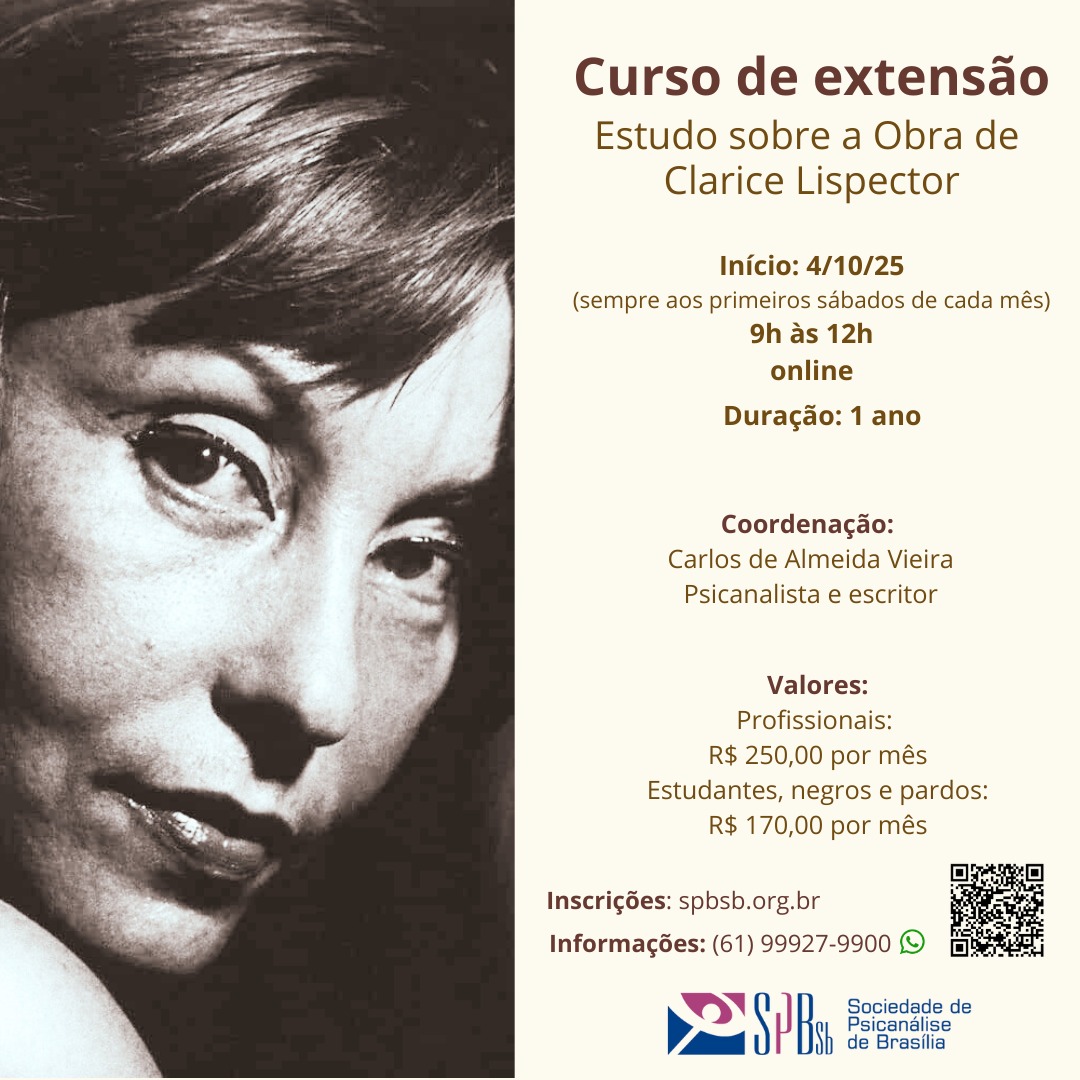 O curso vai se dedicar ao estudo da obra de Clarice Lispector, com a finalidade de ler, estudar e fazer um link com a Psicanálise, a crítica literária e os aspectos filosóficos da obra.