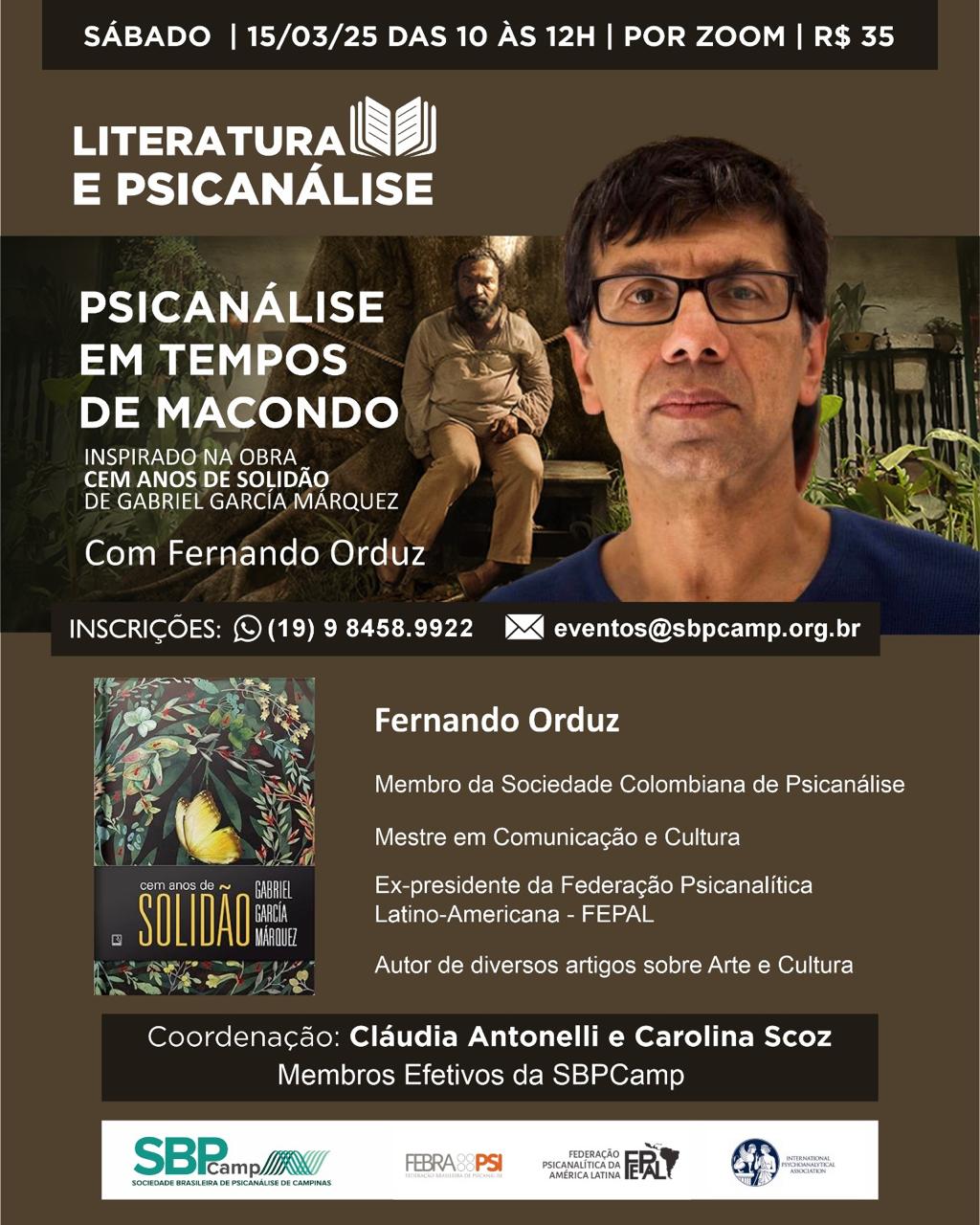 Cem anos de solidão de Gabriel García Márquez é a obra magna que inaugurará o Literatura e Psicanálise da SBPCamp deste ano, que contará com a rica presença de Fernando Orduz para o debate. Membro Titular da Sociedade Colombiana de Psicanálise, Ex-presidente da FEPAL, além de conterrâneo e grande apreciador de García Márquez.