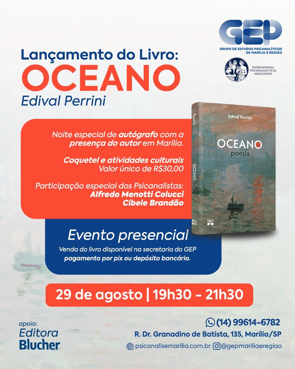 O GEP – Grupo de Estudos Psicanalíticos de Marília e Região realizará o Coquetel de Lançamento do livro ‘Oceano’ com a presença do autor Edival Perrini. O consagrado escritor e psicanalista irá compartilhar sua obra e autografar exemplares dos livros que poderão ser adquiridos no eventos, em uma parceria com a Editora Blucher. Uma noite para usufruir de boa música, poesia, emoção e diversão. Um encontro de arte e psicanálise.