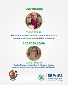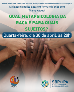A Sociedade Brasileira de Psicanálise de Porto Alegre (SBPdePA), por meio da Comissão Ubuntu e do Núcleo de Estudos sobre Colonialismo, Racismo e Desigualdade, convida para a atividade científica “Qual metapsicologia da raça e para quais sujeitos?”, com Thamy Ayouch, psicanalista, professor da Universidade de Paris e autor de diversos livros sobre gênero, colonialidade e subjetivação.