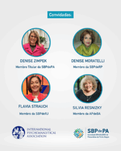 A atividade científica on-line contará com a participação de Denise Zimpek (SBPdePA), Denise Moratelli (SBPdeRP), Flavia Strauch (SBPdeRJ) e Sylvia Resnizky (APdeBA), sob coordenação de Ângela Piva, Membro Titular da SBPdePA.