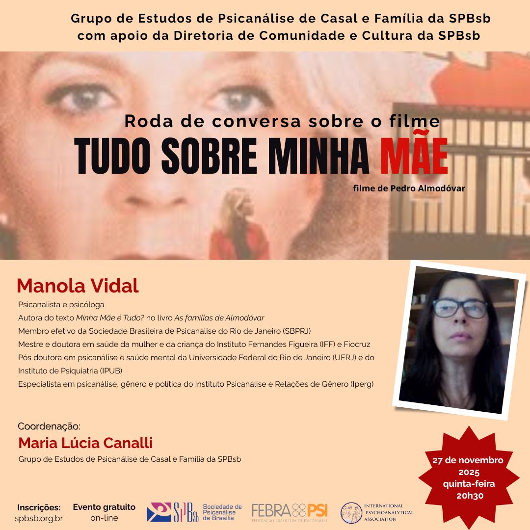 No dia 27 de novembro, o Grupo de Estudos de Psicanálise de Casal e Família da SPBsb com apoio da Diretoria de Comunidade e Cultura da SPBsb, realizará uma roda de conversa online sobre o filme Tudo Sobre a Minha Mãe, de Pedro Almodóvar. O evento será on-line e conduzido por Manola Vidal, psicanalista e psicóloga, autora do texto Minha Mãe é Tudo? no livro As famílias de Almodóvar.
