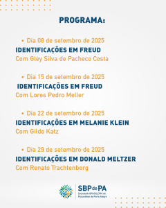 A Diretoria do Instituto de Psicanálise da SBPdePA convida para o Seminário Aberto com o tema “Identificações” que acontecerá nos dias 08, 15, 22 e 29 de setembro de 2025 em formato híbrido.