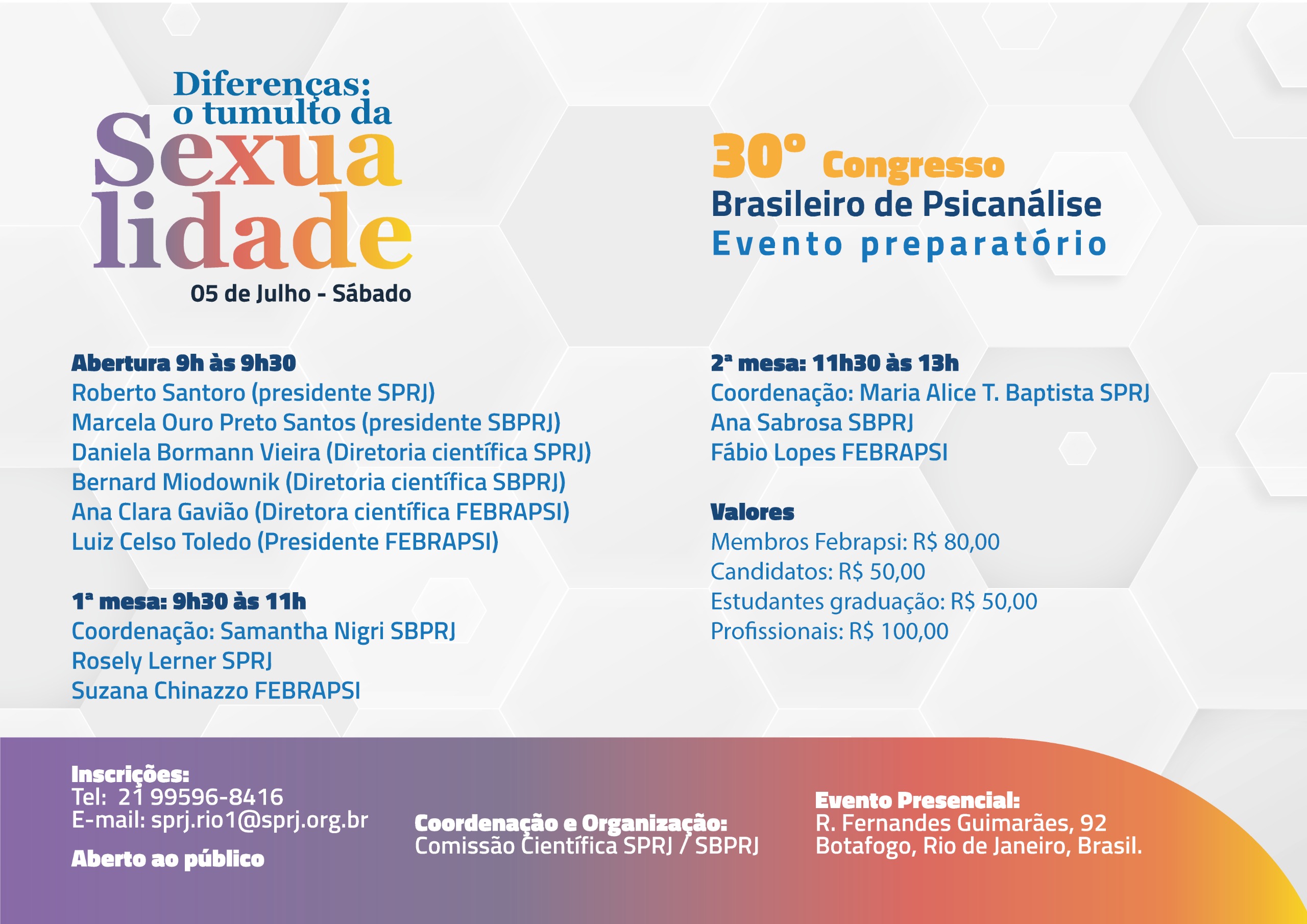 SPRJ – Evento preparatório – 30 Congresso Brasileiro de Psicanálise: Direfenças: O tumulto da Sexualidade