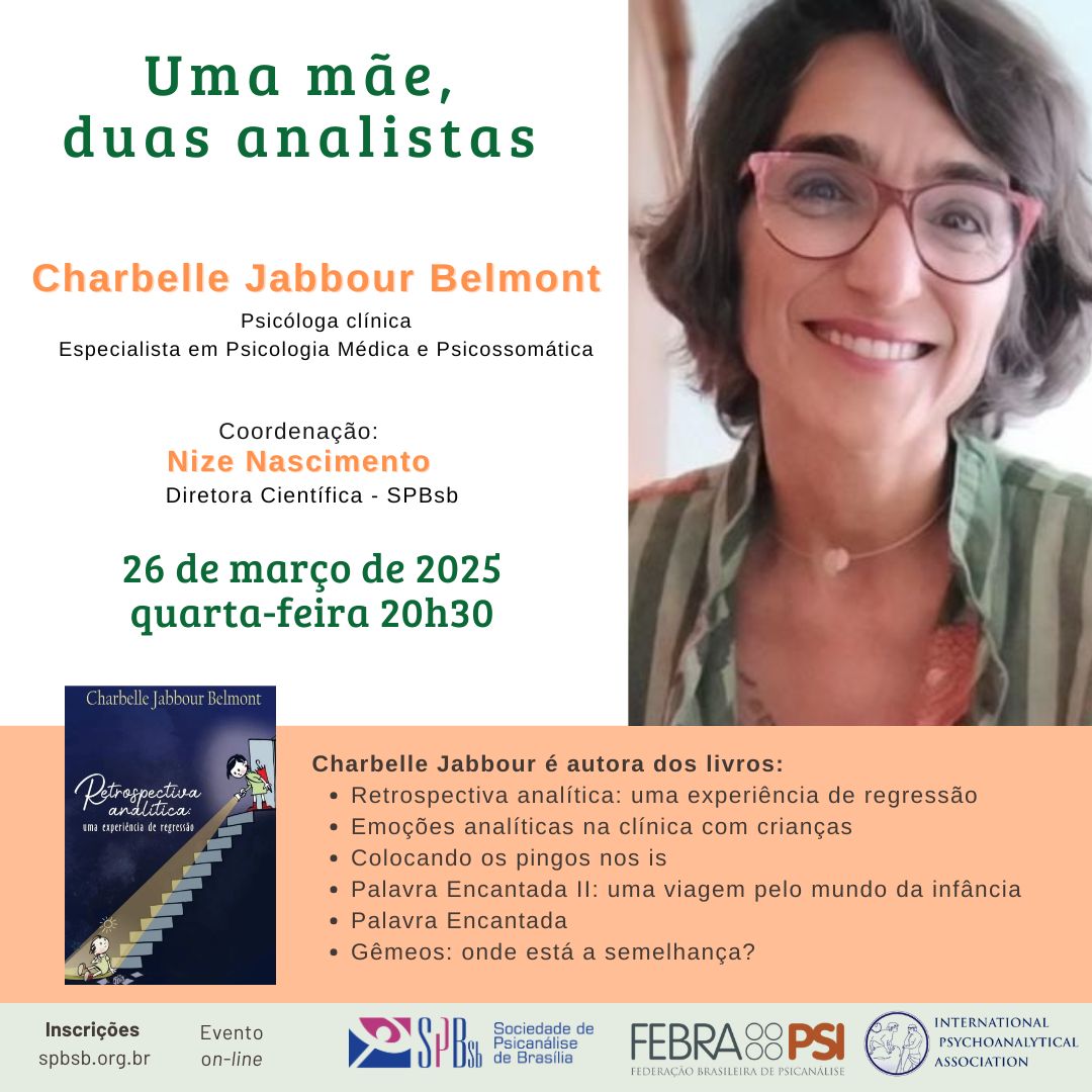 A Diretoria Científica da SPBsb convida para a reunião científica Uma mãe, duas analistas, com apresentação de Charbelle Jabbour Belmont, psicóloga clínica, especialista em psicologia médica e psicossomática. A coordenação será de Nize Nascimento, diretora científica da SPBsb.