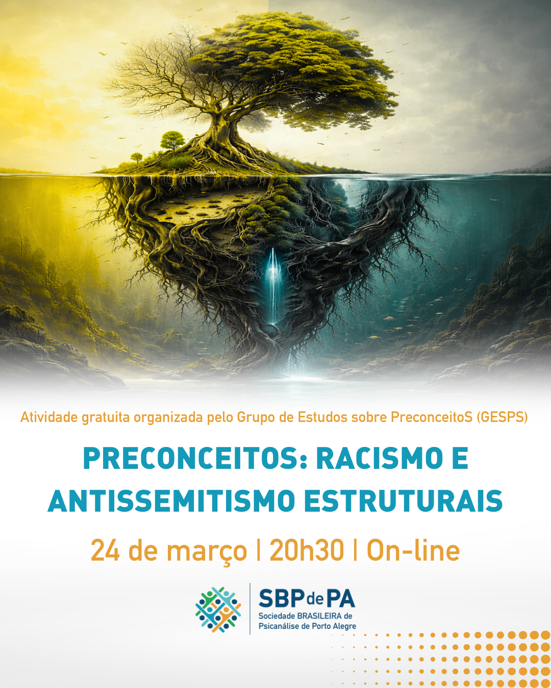 No dia 24 de março de 2026, das 20h30 às 22h, a Sociedade Brasileira de Psicanálise de Porto Alegre promove a atividade científica “PreconceitoS: Racismo e Antissemitismo Estruturais”, realizada em formato on-line, sob coordenação de Ana Rosa Trachtenberg e Augusta Gerchmann, pelo Grupo de Estudos sobre PreconceitoS (GESPS) da SBPdePA. A atividade é aberta e gratuita.