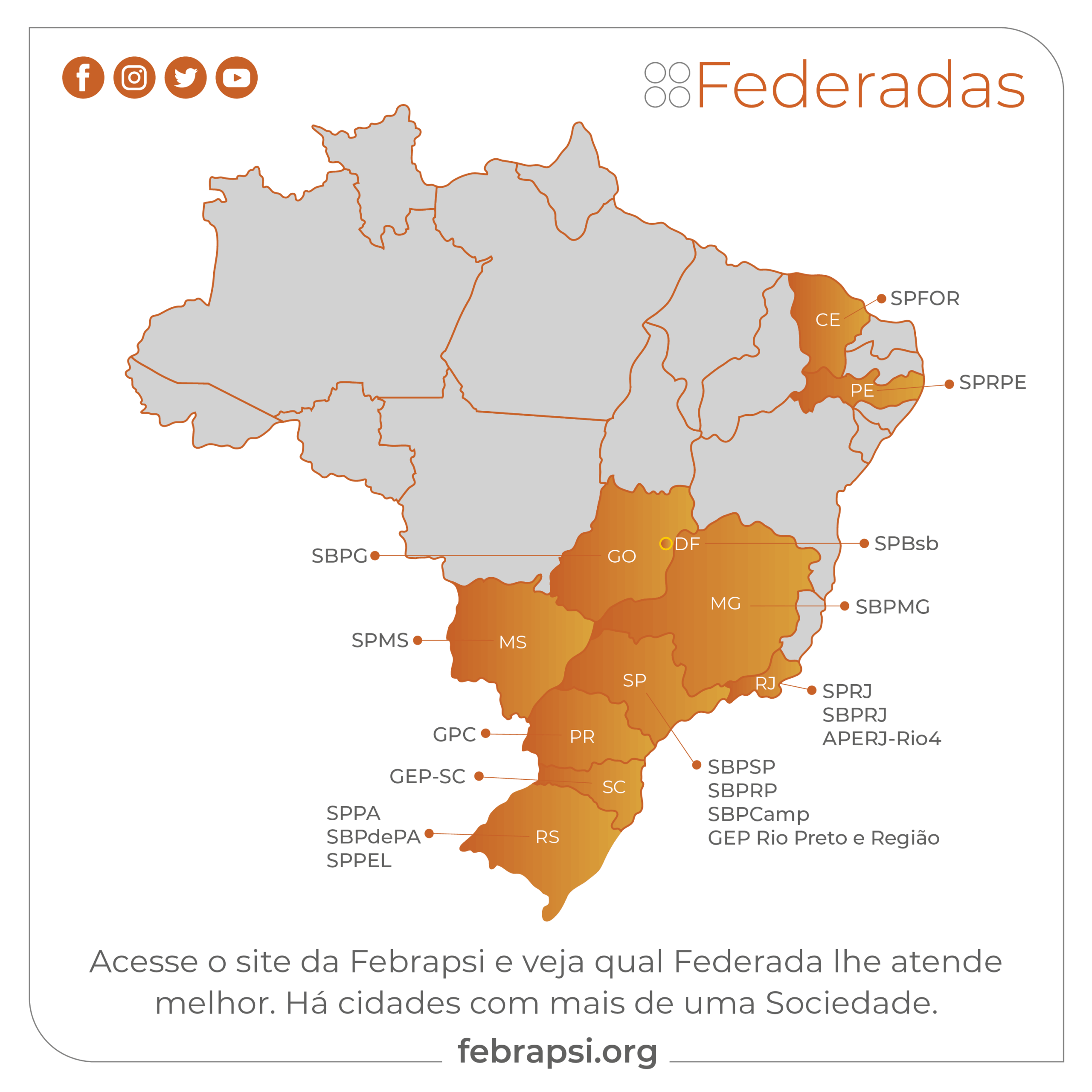 A FEBRAPSI tem dezoito federadas pelo Brasil que oferecem palestras, jornadas, eventos (mesmo para quem não é psicanalista), além de formação psicanalítica, seguindo os padrões estabelecidos pela IPA, a International Psychoanalytical Association. Conheça e visite as nossas Sociedades e Grupos de Estudos: febrapsi.org/quem-somos/federadas/