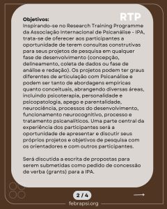 Inspirado no Research Training Programme da Associação Internacional de Psicanálise – IPA, proporciona aos que desenvolverem projetos em qualquer fase — da concepção à redação — com abordagens empíricas ou conceituais ligadas à psicanálise, neurociência, psicoterapia, parentalidade, entre outros.