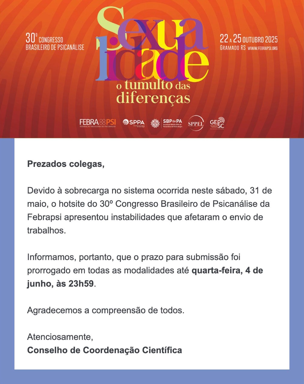 Devido à sobrecarga no sistema ocorrida neste sábado, 31 de maio, o hotsite do 30º Congresso Brasileiro de Psicanálise da Febrapsi apresentou instabilidades que afetaram o envio de trabalhos.