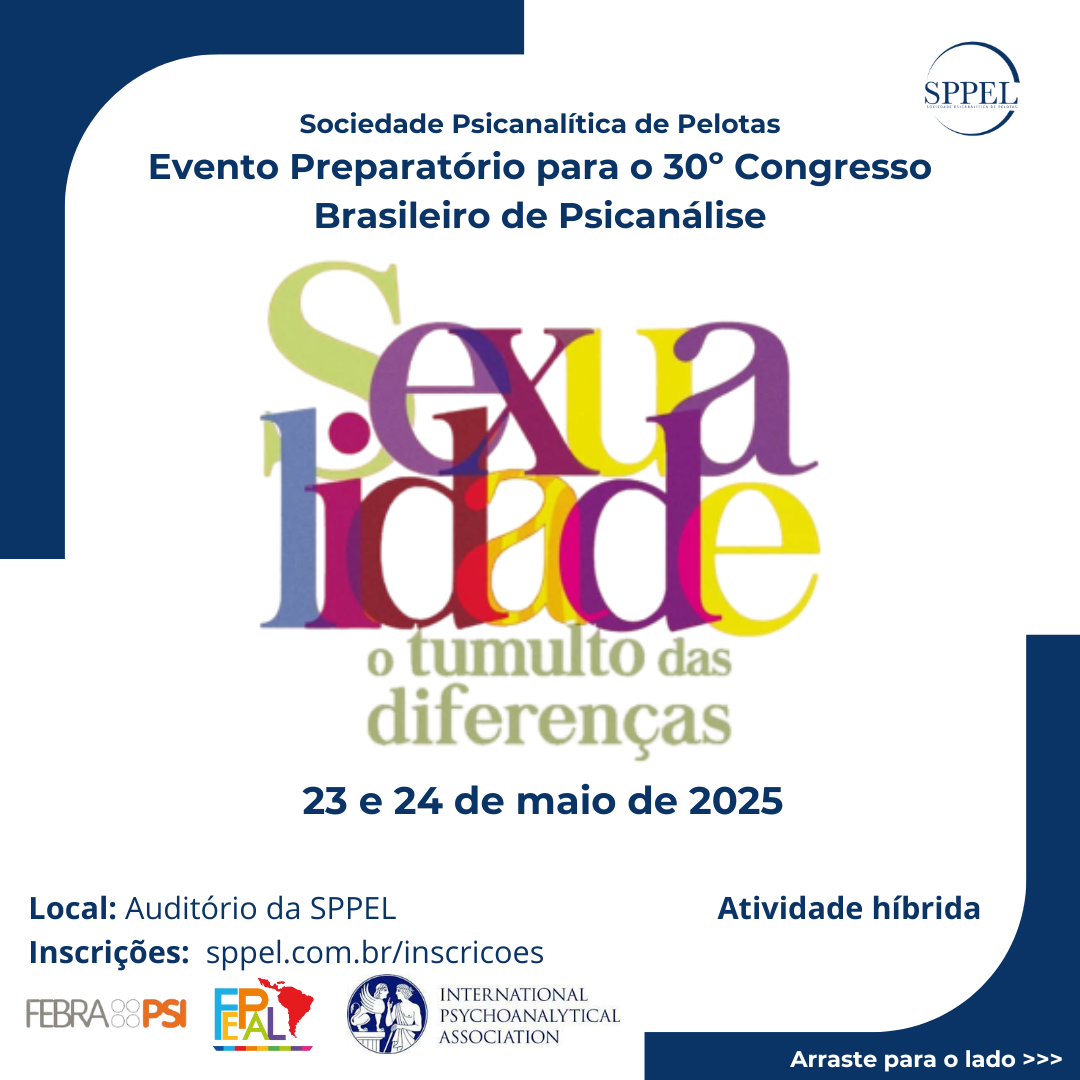 A Sociedade Psicanalítica de Pelotas convida a todos para o Evento Preparatório do 30º Congresso Brasileiro de Psicanálise da FEBRAPSI “Sexualidade, o tumulto das diferenças”.