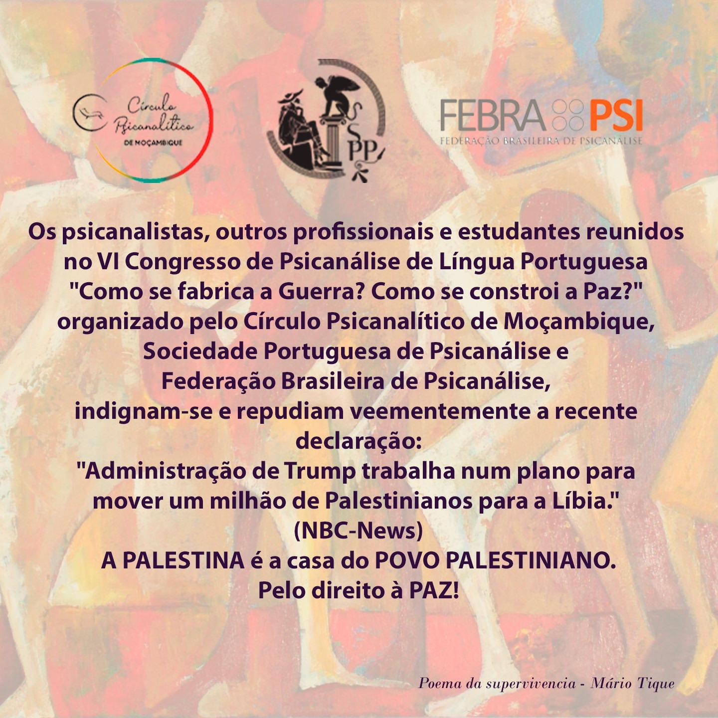 Consideramos que a comunidade psicanalítica tem um papel importante a desempenhar, seja para resistir e não se deixar calar, como fizeram nossos colegas em Maputo, para participar ativa e socialmente do debate, seja para colaborar com a criação de estratégias para denunciar o uso perverso das mentiras nas redes sociais. A paz não é, nem nunca foi, garantida. Ela precisa ser construída, cuidada e defendida.
